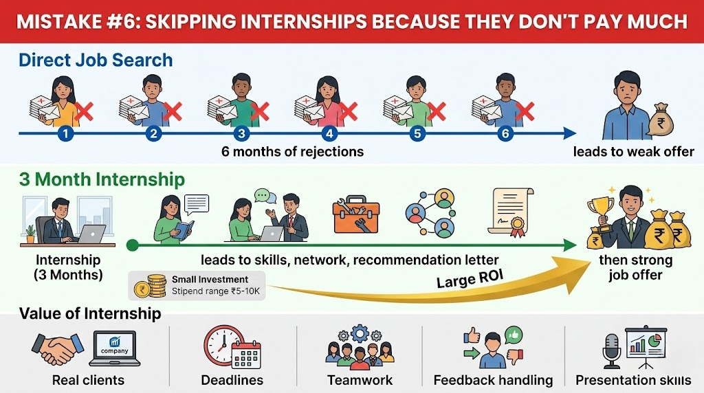 Many freshers skip internship opportunities because they pay ₹5,000-10,000 per month. They think: “I completed a course, I should get a full-time job immediately.”
